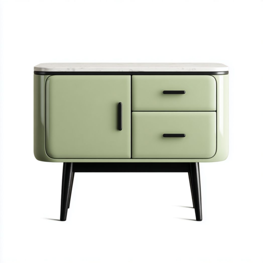 Panneaux de bois, façades peintes, poignées en métal, pieds en métal