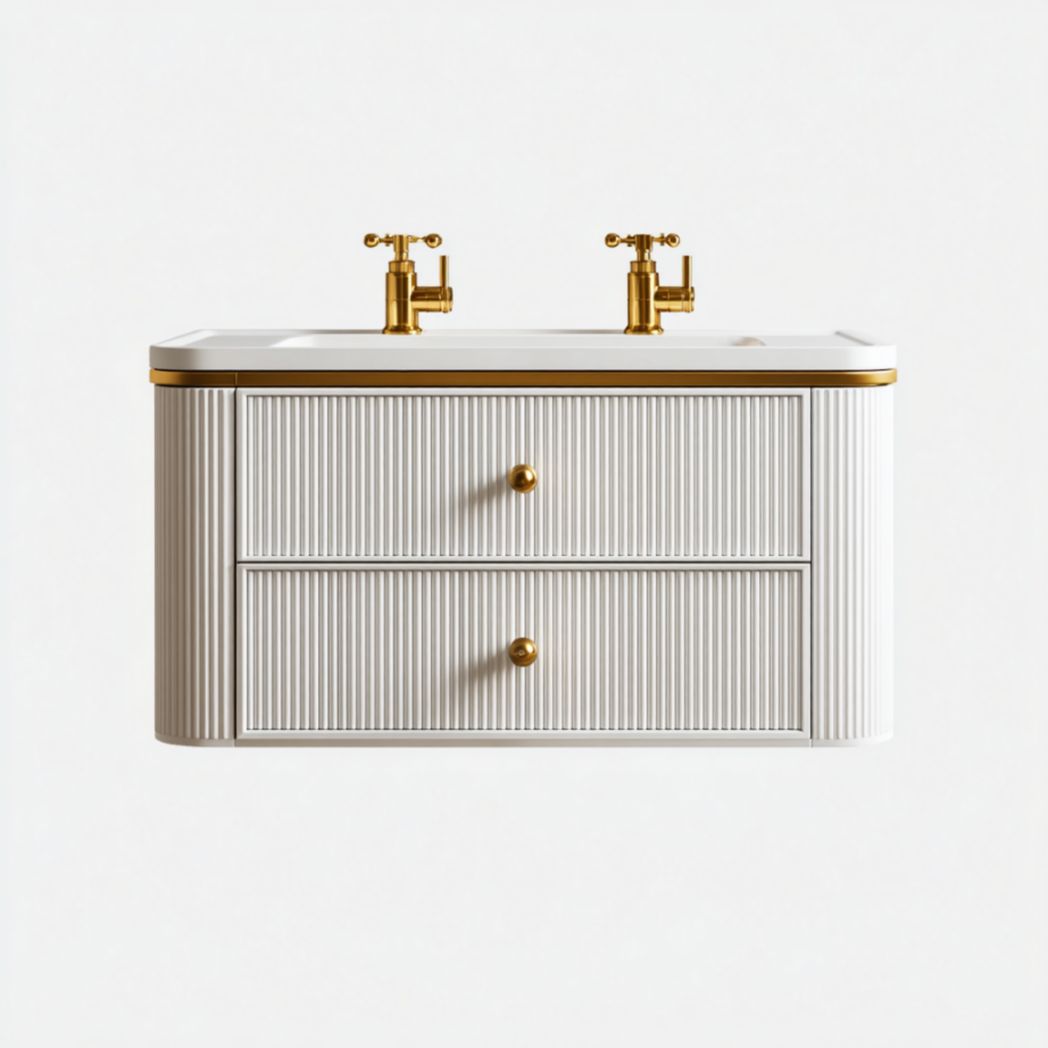 Meuble de salle de bain suspendu double vasque en bois massif peint blanc avec vasque intégrée en céramique